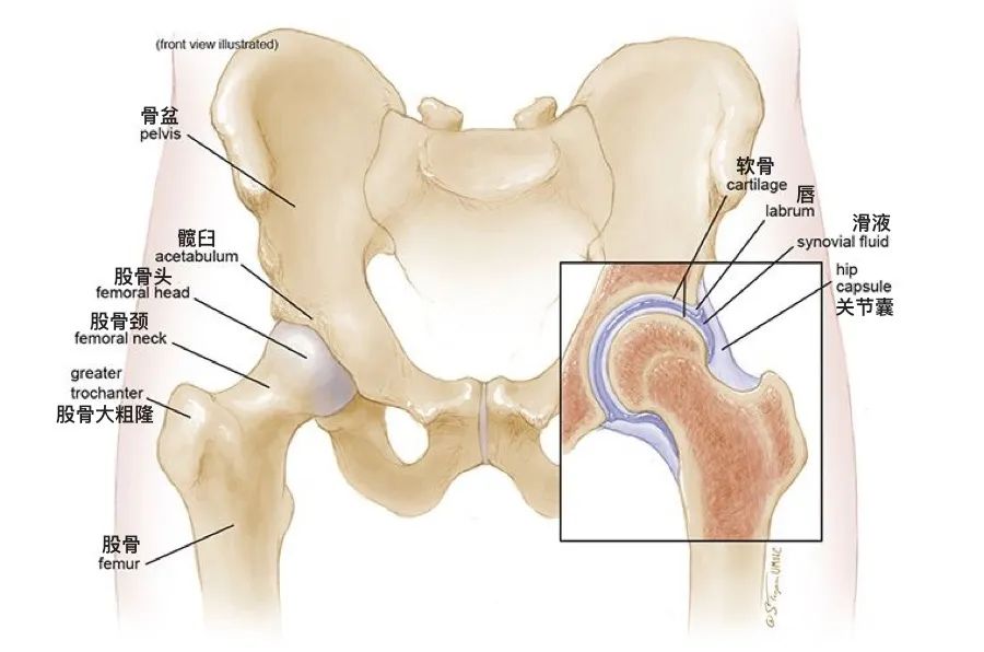 髋关节是一种球形的关节,包含一个股骨侧的球形的股骨头和一个骨盆侧的似碗状的髋臼,球状表层及碗状物内表层均由平滑的软骨覆盖,滑囊膜分泌滑液使摩擦降低至最小。