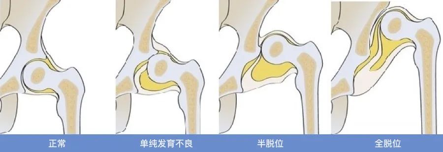 髋关节发育不良时,髋臼不能很好地覆盖股骨头,这样髋关节就不能有效地承载体重,容易发生磨损,最终因疼痛和行走困难造成患者残疾。一般髋关节发育不良包括单纯髋关节发育不良(覆盖不够)、半脱位和全脱位三种情况。
