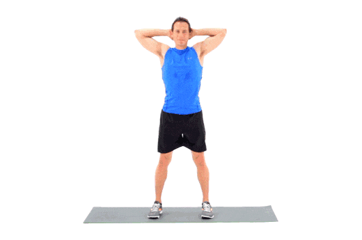 直立,两脚分开等肩宽,两手交叉抱住后脑;腰部发力缓缓下蹲,膝盖弯曲90度,背部挺直不要弯曲,然后再缓缓站直。