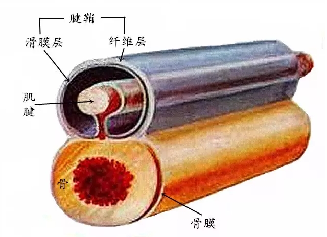 它分两层包绕着肌腱,两层之间一空腔即滑液腔,内有腱鞘滑液;