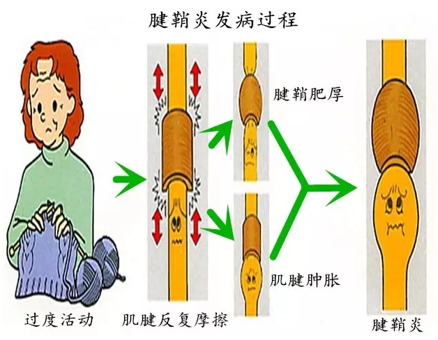 肌腱长期在此过度摩擦,即可发生肌腱和腱鞘的损伤性炎症,引起肿胀,称为腱鞘炎。若不治疗,便有可能发展成永久性活动不便。