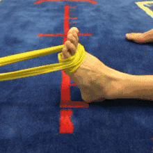以皮筋为阻力,远端固定,套在脚上,从伸直位尽量用力勾到屈曲位,稍作停顿,慢慢放开,反复做15-20次,休息30秒,共做4-6组,每天1-2次。
