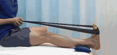 以皮筋为阻力,近端固定,套在脚上,从屈曲位尽量用力绷到伸直位,稍作停顿,慢慢放开,反复做15-20次,休息30秒,共做4-6组,每天1-2次。