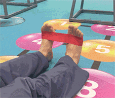 坐在床上,膝关节屈曲,双腿、膝关节、足跟并拢,脚面稍绷直,用弹力带套住两脚,患脚用力外翻,动作标准、数量同上。