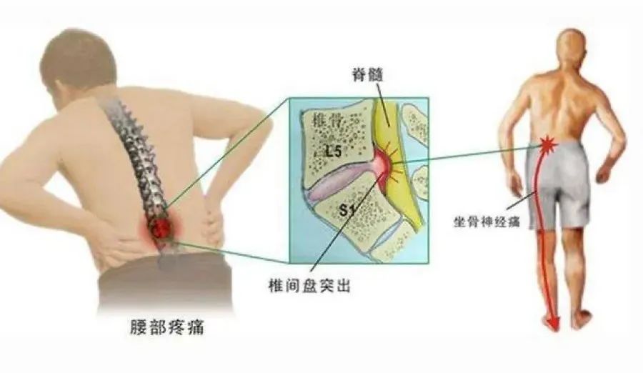 这种腰痛要么发生左边,要么发生在右边,或是两边都疼,但一边会更重一些。腰痛往往伴有一边腿疼、腿麻、酸胀乏力,从上往下一直疼麻到小腿或是脚上。如果你是这样的腰痛,就要注意是否有腰椎间盘突出压迫坐骨神经的问题了。