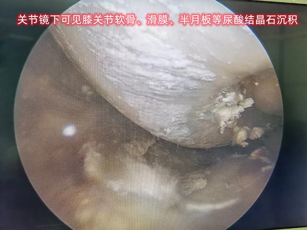 关节镜检查不仅有助于早期明确诊断,而且还可一起行关节清理术,清除软骨表面及滑膜表面沉积的尿酸盐结晶,并通过大量盐水冲洗关节腔清除关节腔内沉积的尿酸盐结晶,减轻关节内炎症反应,延缓骨性关节炎的发生。