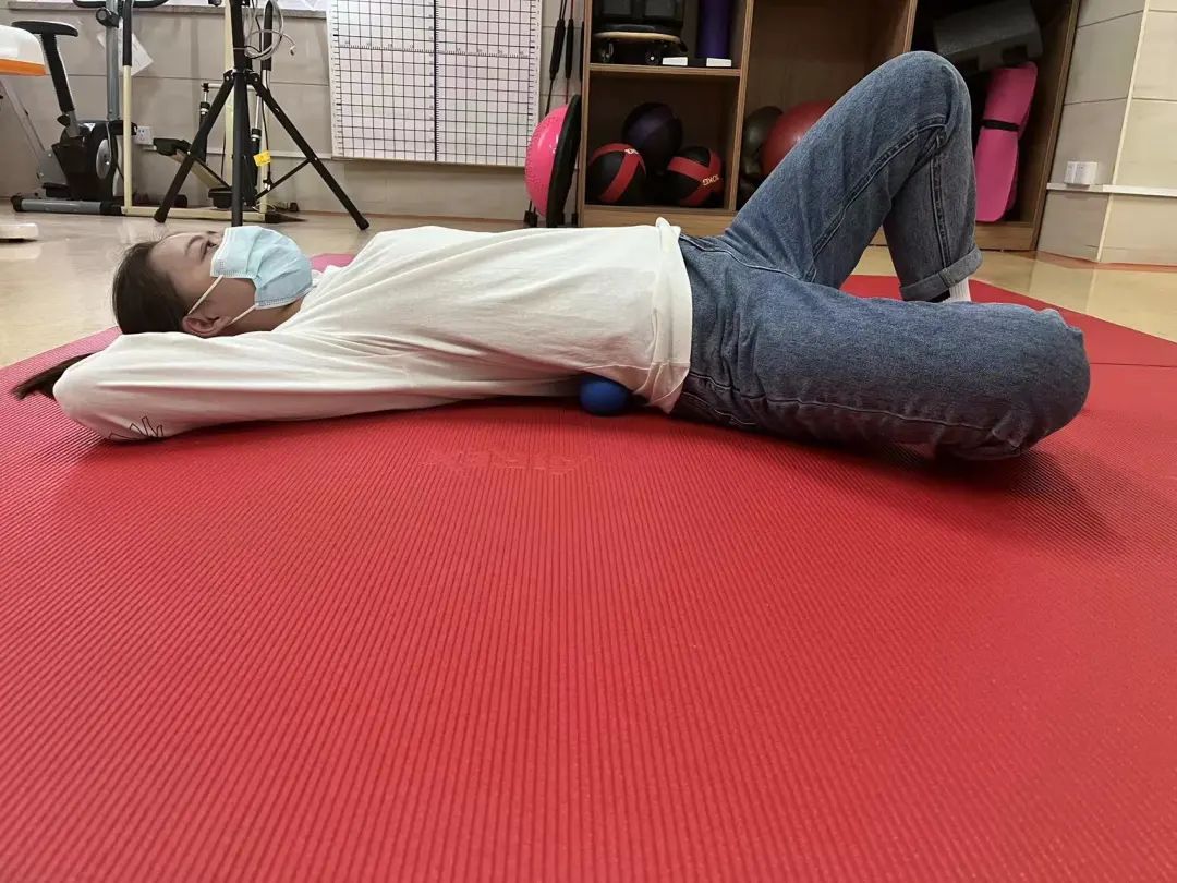 取仰卧位,微微屈膝,双手交叉枕于脑后,将网球放在腰部脊柱与胸侧面中间的位置。按压一侧把髋打开,借腿和双肘力量调节按压力度,重复10次,换方向。