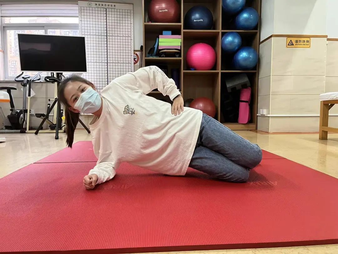 侧卧位,膝关节和下方手撑地,腰部用力撑起身体,肘部和肩膀在一条直线上,头 背 大腿也呈一条直线,保持髋部向上方顶的力量,收紧下方的侧腰部。
