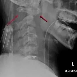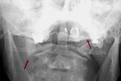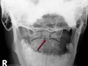 为C1爆裂性骨折,多由压缩性外力造成,表现为C1双侧前后弓断裂,张口位显示:寰椎双侧分离移位,不伴有神经损伤。