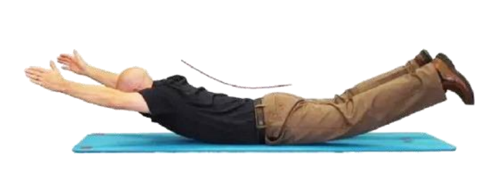 俯卧位腰部肌肉发力收缩,两掌心相对,两臂打开与肩平齐,双腿分开与肩平齐,向上平移,实现腰部收缩。坚持10-15秒,重复进行15次。
